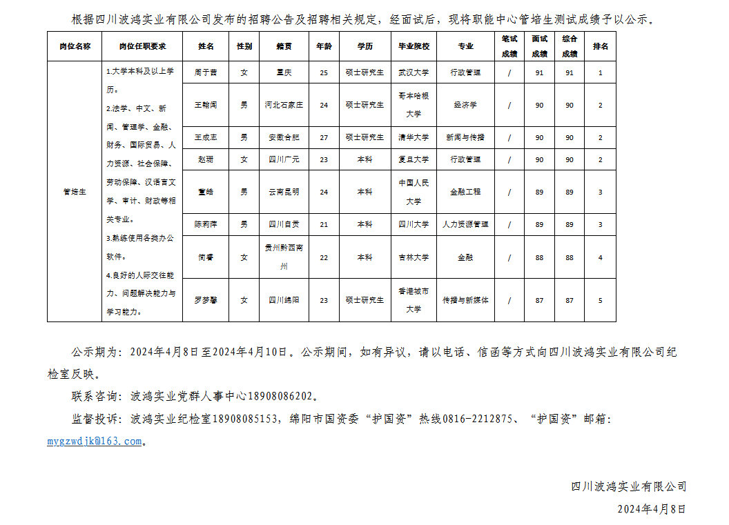 四川波鴻實(shí)業(yè)有限公司關(guān)于招聘職能中心管培生測試成績的公示