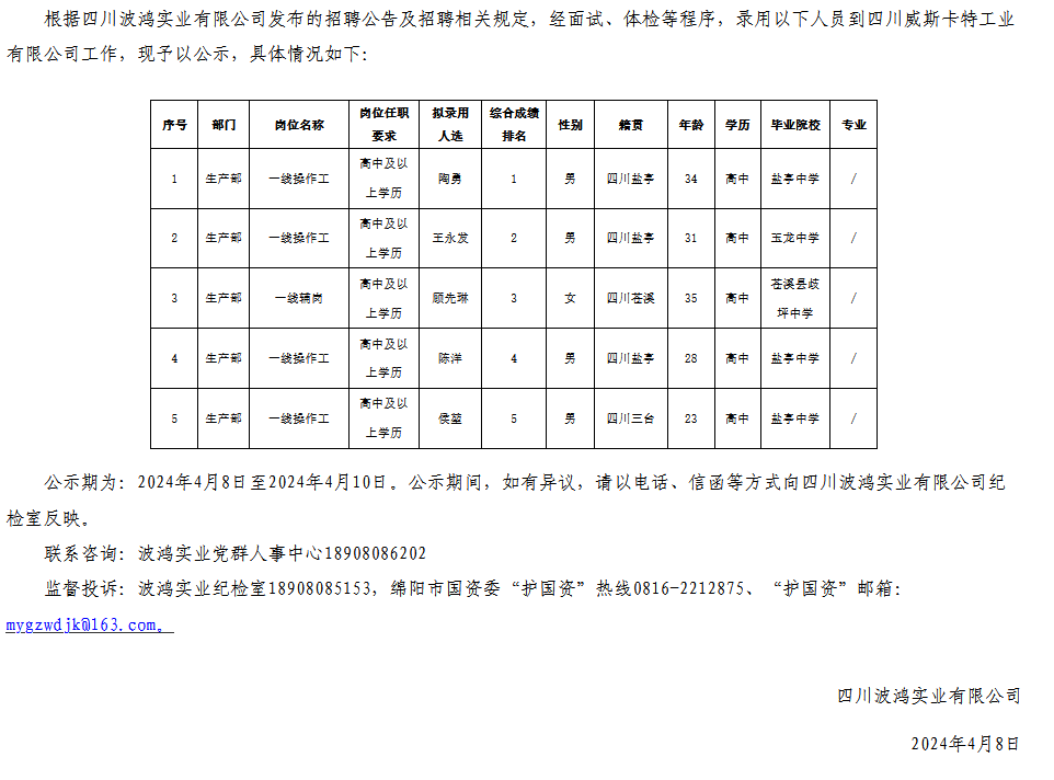 四川波鴻實(shí)業(yè)有限公司關(guān)于3月招聘四川威斯卡特工業(yè)有限公司一線崗位擬錄用人員的公示
