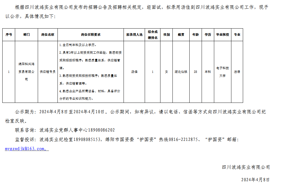 四川波鴻實業(yè)有限公司關(guān)于招聘供應(yīng)鏈專員擬錄用人員的公示