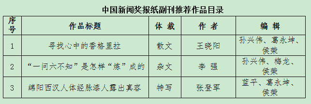 根據(jù)《中國(guó)新聞獎(jiǎng)評(píng)選辦法》規(guī)定的程序,經(jīng)民主推薦及評(píng)委會(huì)評(píng)議,綿陽(yáng)日?qǐng)?bào)社擬推薦以下3件作品參加中國(guó)新聞獎(jiǎng)報(bào)紙副刊作品的初評(píng),現(xiàn)予以公示。公示期為4月9日至15日。如有異議,可通過書面、電話方式,于4月15日17時(shí)前進(jìn)行反映。