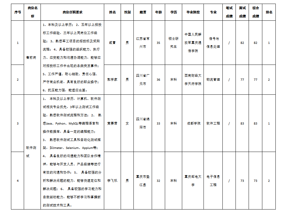 根據(jù)四川九州軟件有限公司發(fā)布的招聘公告及招聘相關(guān)規(guī)定,經(jīng)筆試、面試等程序,現(xiàn)將筆試(面試)成績(jī)予以公示。
