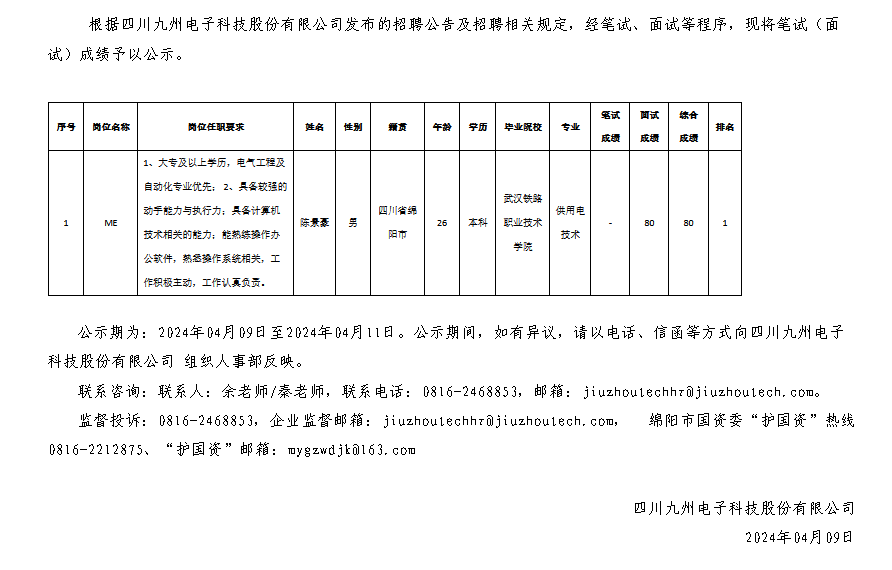 四川九州電子科技股份有限公司關(guān)于招聘ME崗位測(cè)試成績(jī)的公示