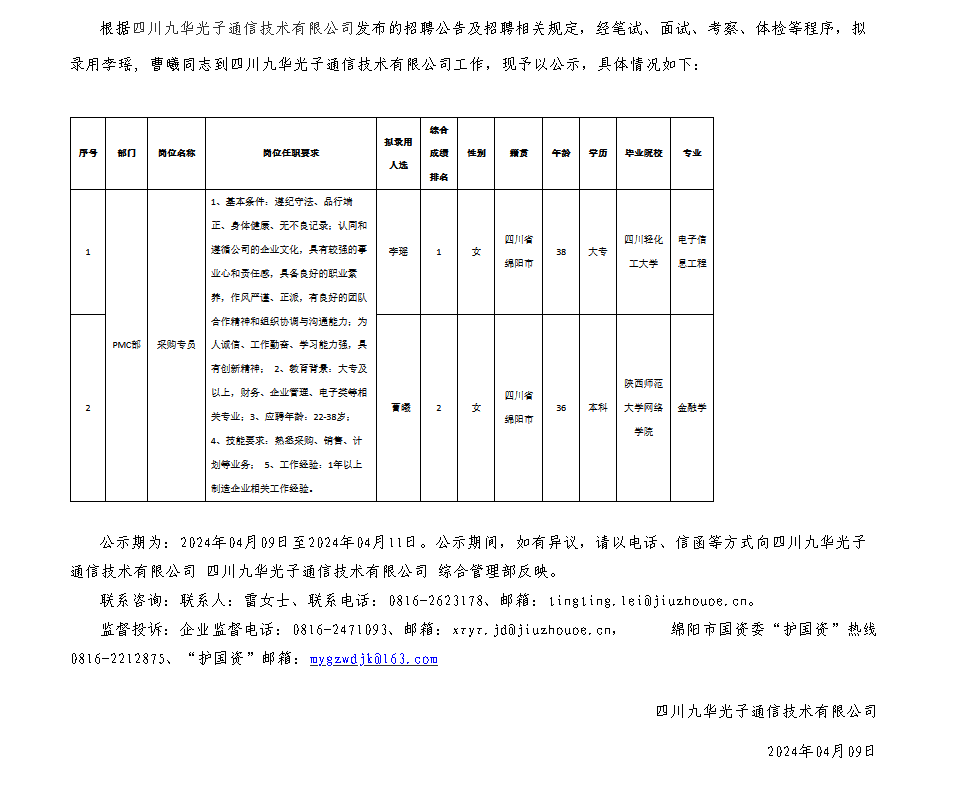 四川九華光子通信技術(shù)有限公司關(guān)于招聘采購專員擬錄用人員的公示