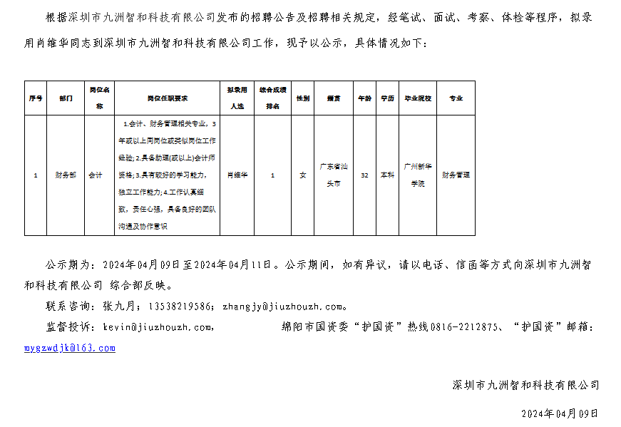 深圳市九洲智和科技有限公司關(guān)于招聘會(huì)計(jì)崗擬錄用人員的公示