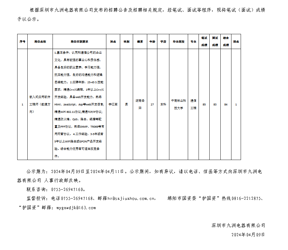 深圳市九洲電器有限公司關(guān)于招聘嵌入式應(yīng)用軟件工程師測(cè)試成績(jī)的公示