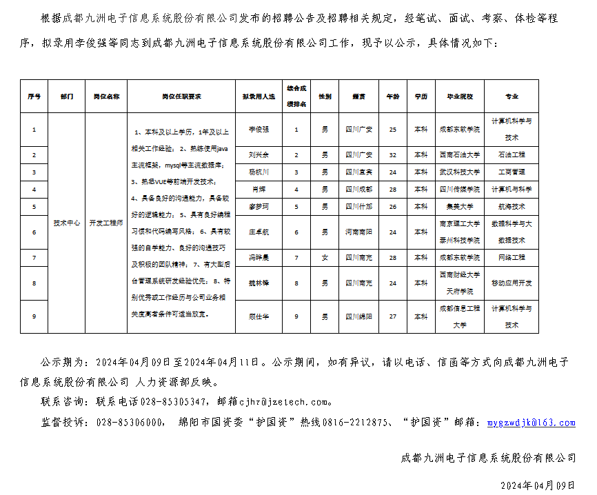 成都九洲電子信息系統(tǒng)股份有限公司關(guān)于招聘開發(fā)工程師擬錄用人員的公示