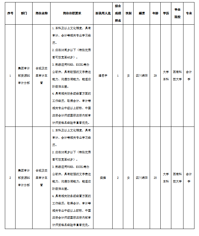 根據(jù)四川長虹置業(yè)有限公司3月6日發(fā)布的招聘公告及招聘相關(guān)規(guī)定,經(jīng)面試、考察等程序,擬錄用潘思宇、梁雍同志到集團(tuán)審計(jì)部資源BG審計(jì)分部工作,現(xiàn)予以公示,具體情況如下: