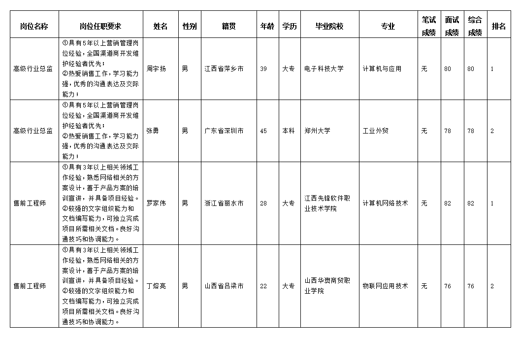 根據(jù)四川長(zhǎng)虹佳華信息產(chǎn)品有限責(zé)任公司發(fā)布的招聘公告及招聘相關(guān)規(guī)定,經(jīng)筆試、面試等程序,現(xiàn)將筆試(面試)成績(jī)予以公示。