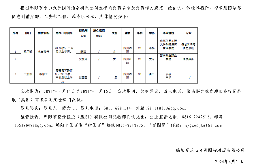綿陽(yáng)富樂(lè)山九洲國(guó)際酒店有限公司關(guān)于招聘總臺(tái)接待等一線工作崗位擬錄用人員的公示