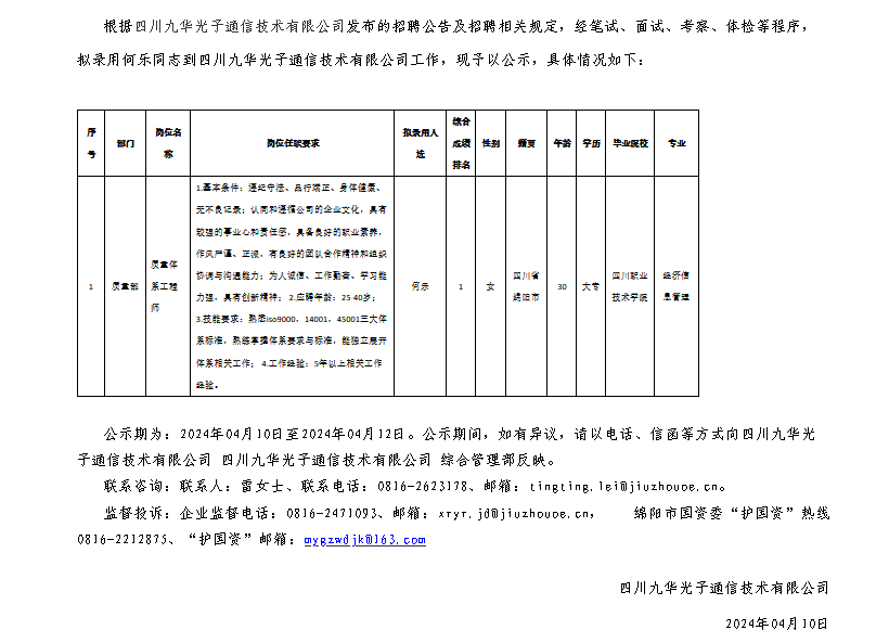 四川九華光子通信技術(shù)有限公司關(guān)于招聘質(zhì)量體系工程師擬錄用人員的公示