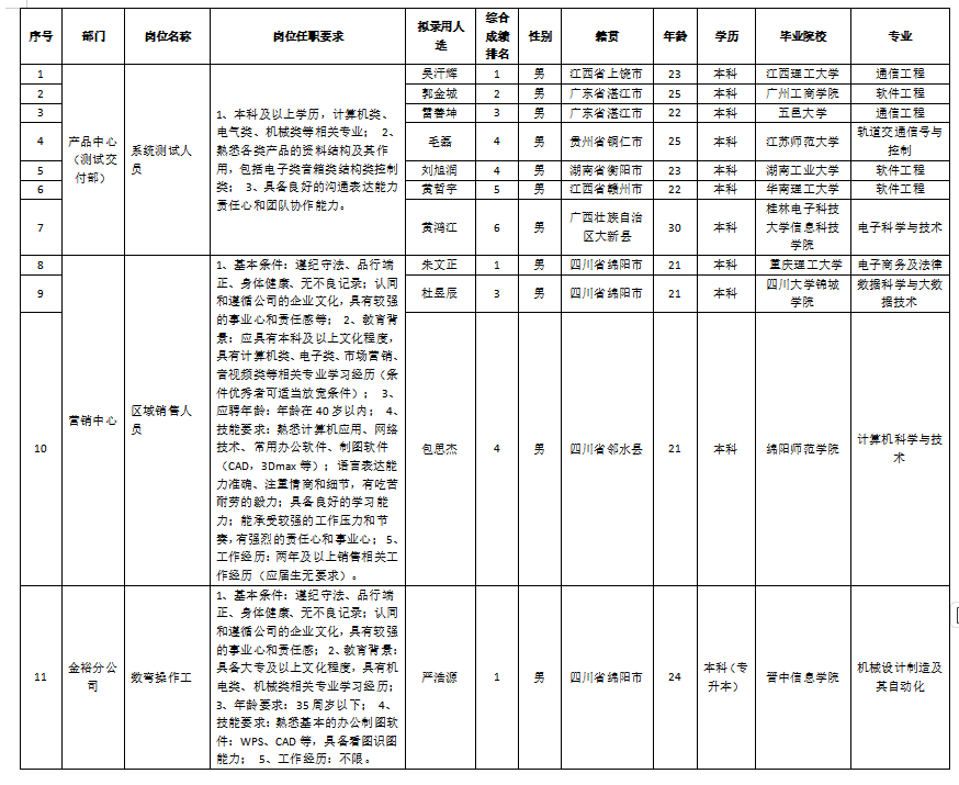 根據(jù)四川湖山電器股份有限公司發(fā)布的招聘公告及招聘相關規(guī)定,經(jīng)筆試、面試、考察、體檢等程序,擬錄用朱文正,杜昱辰,包思杰,嚴浩源,吳汗輝,郭金城,雷善坤,毛磊,劉旭潤,黃哲宇,黃鴻江同志到四川湖山電器股份有限公司工作,現(xiàn)予以公示,具體情況如下: