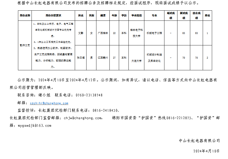 中山長虹電器有限公司關于招聘散件工藝崗位測試成績的公示