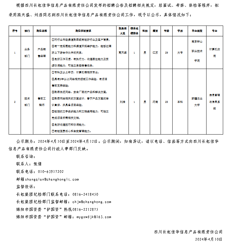 四川長(zhǎng)虹佳華信息產(chǎn)品有限責(zé)任公司關(guān)于招聘產(chǎn)品銷售經(jīng)理等崗位擬錄用人員的公示