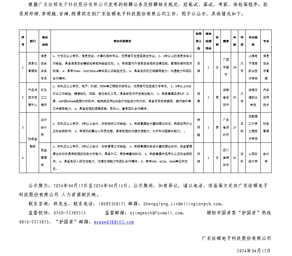 廣東依頓電子科技股份有限公司關于招聘資金管理崗等崗位擬錄用人員的公示