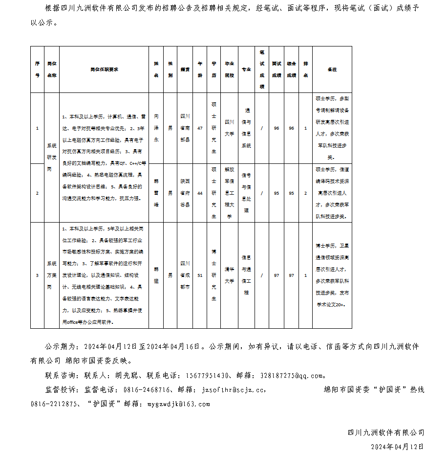 四川九洲軟件有限公司關(guān)于招聘系統(tǒng)方案等崗位測(cè)試成績(jī)的公示