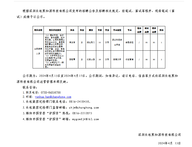 深圳長(zhǎng)虹聚和源科技有限公司關(guān)于招聘業(yè)務(wù)跟單人員測(cè)試成績(jī)的公示