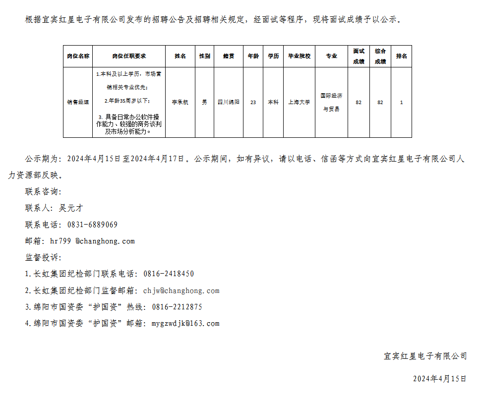 宜賓紅星電子有限公司關(guān)于招聘銷售經(jīng)理崗位測(cè)試成績(jī)的公示