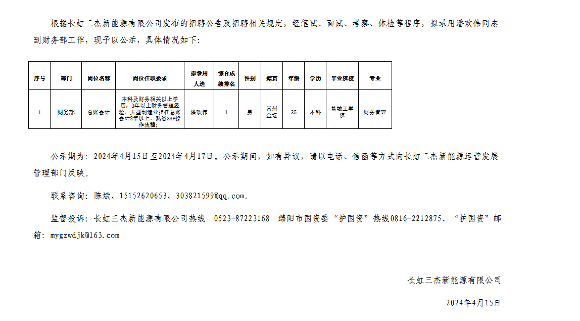 長虹三杰新能源有限公司關(guān)于招聘總賬會計崗位擬錄用人員的公示