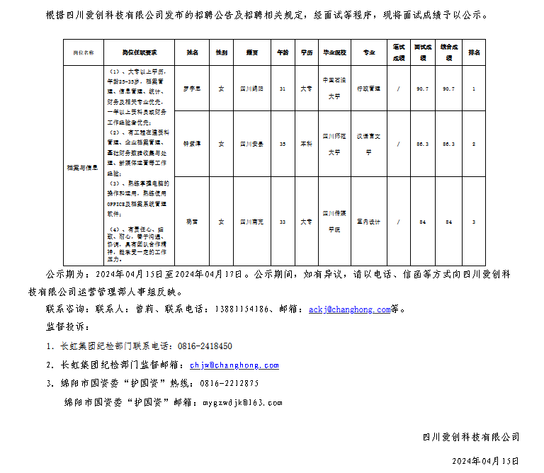 四川愛創(chuàng)科技有限公司關(guān)于招聘檔案與信息崗位測試成績的公示