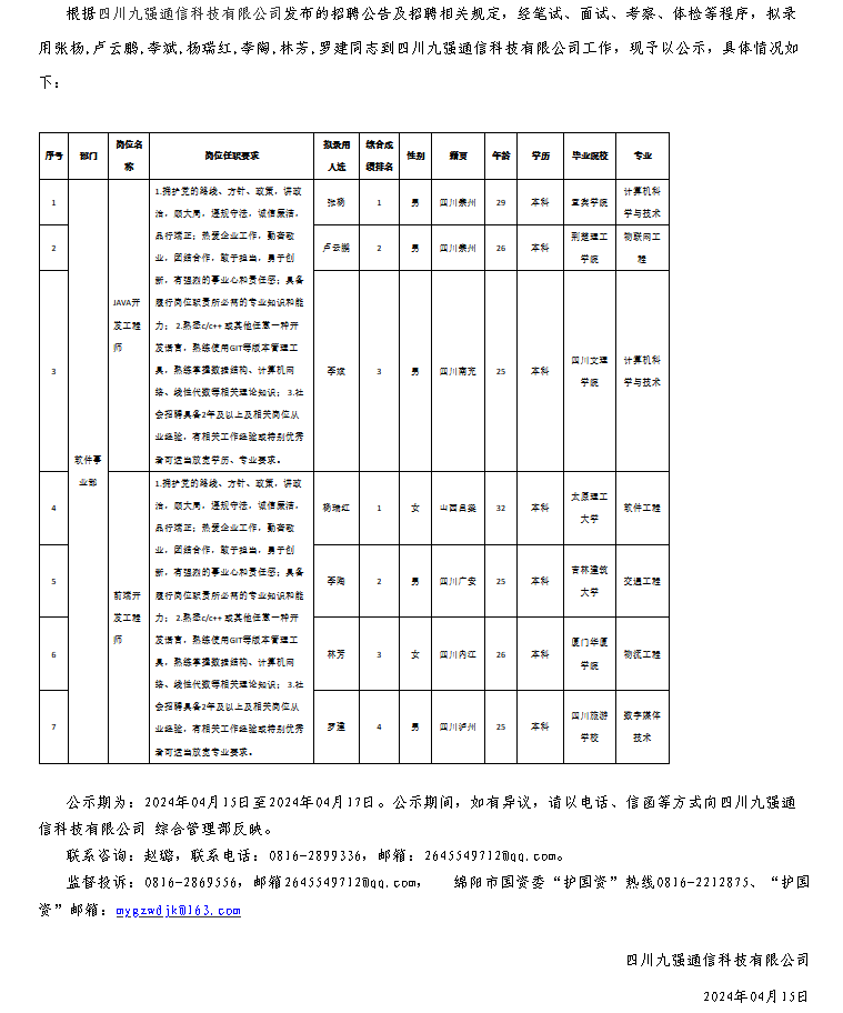 四川九強通信科技有限公司關(guān)于招聘JAVA開發(fā)工程師等崗位擬錄用人員的公示