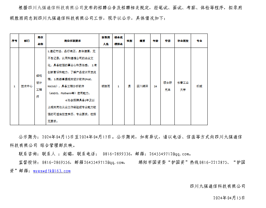 四川九強(qiáng)通信科技有限公司關(guān)于招聘結(jié)構(gòu)設(shè)計(jì)工程師擬錄用人員的公示