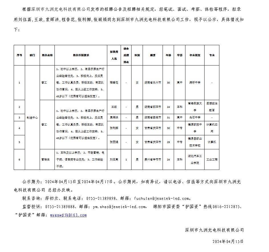 深圳市九洲光電科技有限公司關(guān)于招聘管培生等崗位擬錄用人員的公示