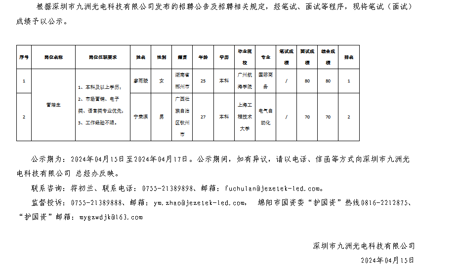 深圳市九洲光電科技有限公司關(guān)于招聘管培生崗位測(cè)試成績(jī)的公示