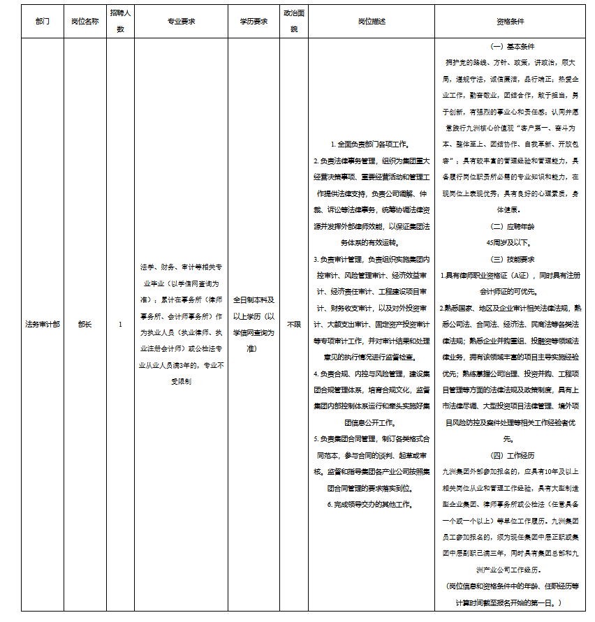 (一)應聘者應于報名時間內將《四川九洲投資控股集團有限公司社會化選聘中層管理人員報名表》(詳見附件)及其他應提供的報名資料,以圖片或PDF文件格式打包壓縮后請用“報名職位名稱+本人姓名”命名,發(fā)送至指定郵箱15196261795@163.com,聯(lián)系人張女士(組織人事部),聯(lián)系電話:0816-2468312。 其他應提供的報名資料包括:本人身份證、學歷學位證書(含學信網(wǎng)證明)、專業(yè)技術資格證書、職(執(zhí))業(yè)資格證書、工作經(jīng)歷證明(任職文件、勞動合同等)、近年來主要工作業(yè)績(成果)、獲獎證書等相關材料。(二)凡有下列情形之一的,不得報名1.因犯罪受過刑事處罰的。2.被開除中國共產(chǎn)黨黨籍的。3.被開除公職的。4.被依法列為失信聯(lián)合懲戒對象的。5.受到誡勉、組織處理或者黨紀政務處分等影響期未滿或者期滿影響使用的。6.涉嫌違紀違法正在接受有關機關審查尚未作出結論的。7.正在接受審計機關審計的。8.法律法規(guī)規(guī)定的其他情形。