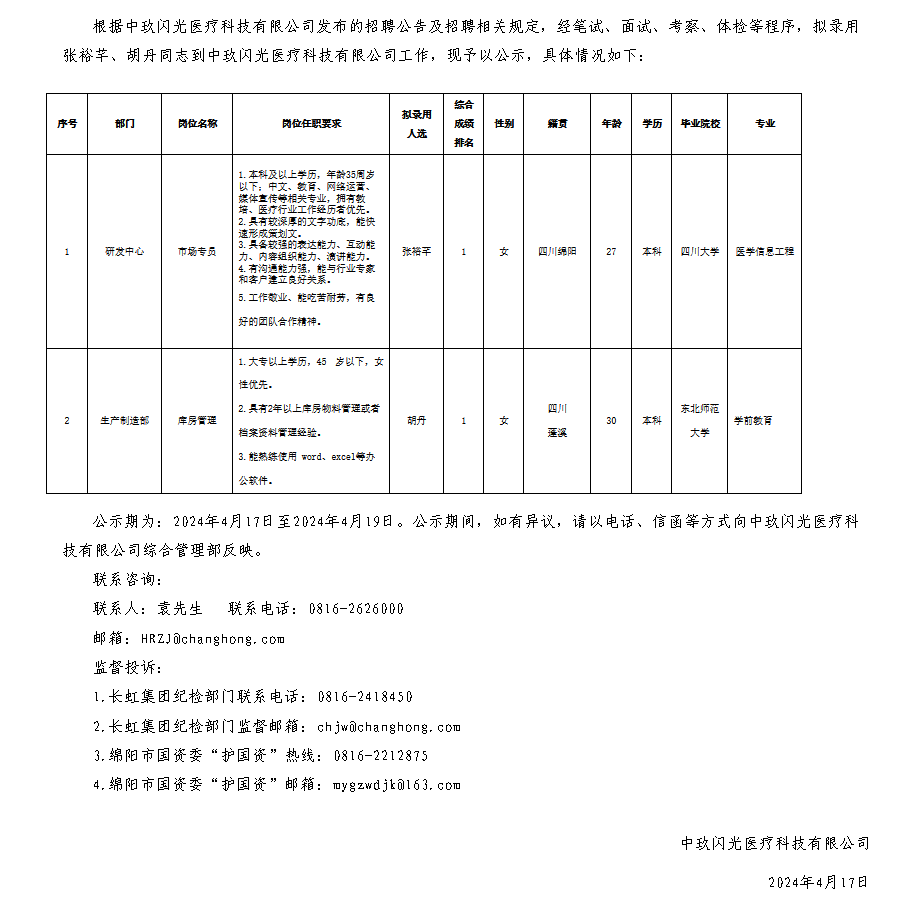 中玖閃光醫(yī)療科技有限公司關(guān)于招聘市場專員等崗位擬錄用人員的公示