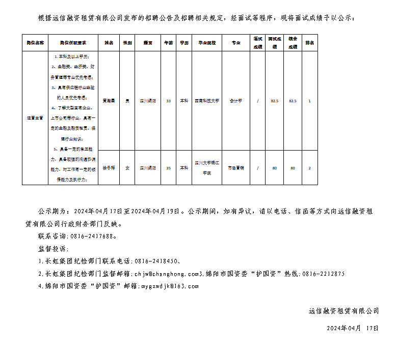 遠(yuǎn)信融資租賃有限公司關(guān)于招聘運(yùn)營主管崗位測試成績的公示