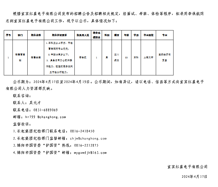 宜賓紅星電子有限公司關(guān)于招聘銷售經(jīng)理崗位擬錄用人員的公示