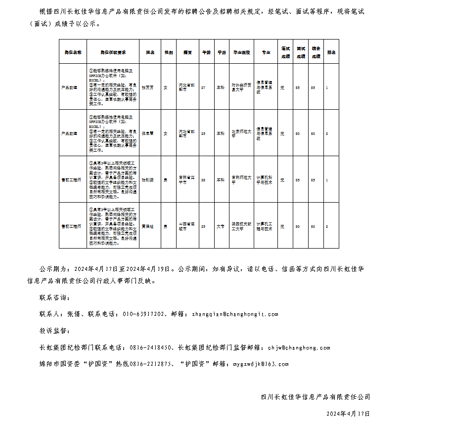 四川長(zhǎng)虹佳華信息產(chǎn)品有限責(zé)任公司關(guān)于招聘產(chǎn)品助理等崗位測(cè)試成績(jī)的公示