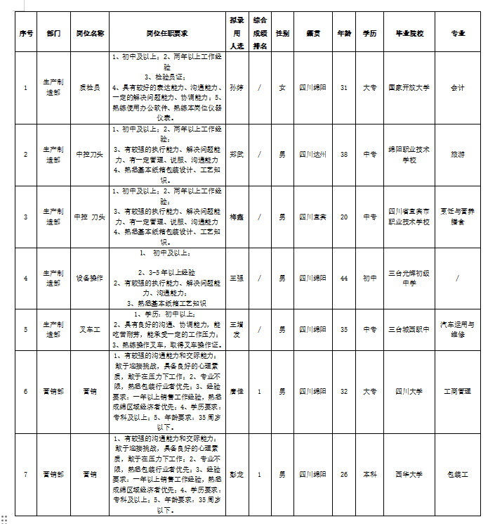 根據(jù)長虹包裝印務(wù)有限公司發(fā)布的招聘公告及招聘相關(guān)規(guī)定,經(jīng)筆試、面試、考察、體檢等程序,擬錄用孫婷、鄭武、梅鑫、王強、王增發(fā)、唐佳、彭龍同志到長虹包裝印務(wù)有限公司工作,現(xiàn)予以公示,具體情況如下: