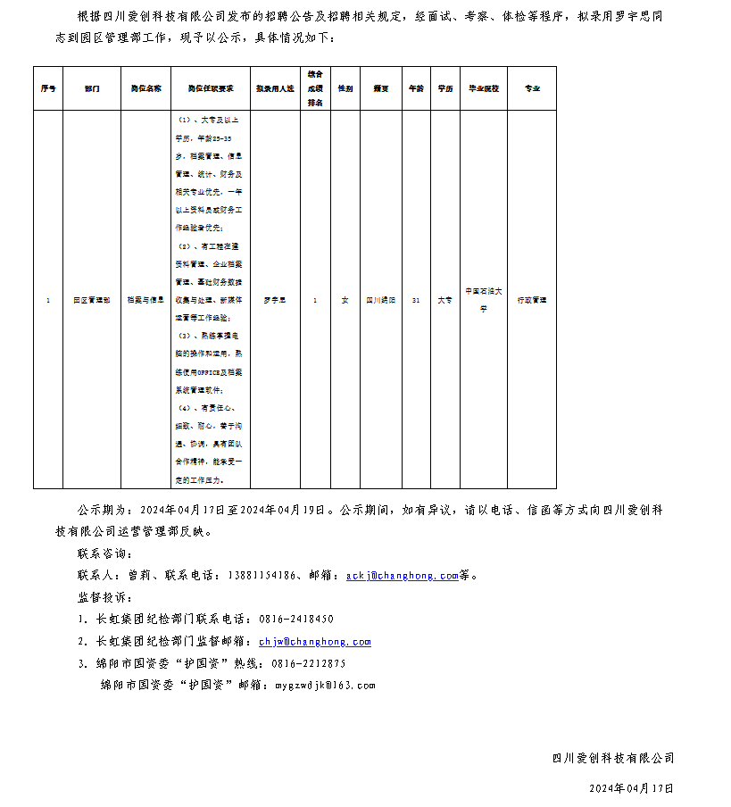 四川愛創(chuàng)科技有限公司關(guān)于招聘檔案與信息崗位擬錄用人員的公示