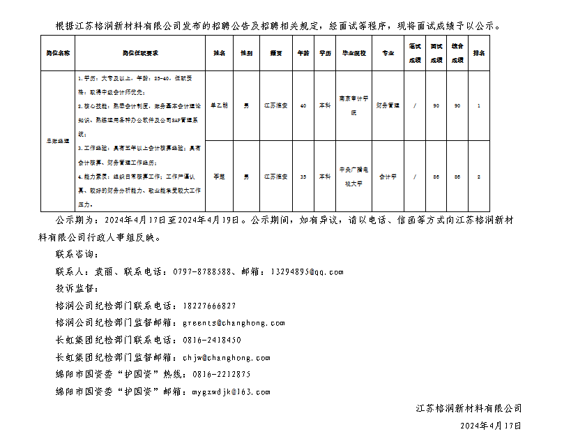 江蘇格潤新材料有限公司關于招聘總賬經(jīng)理崗位測試成績的公示