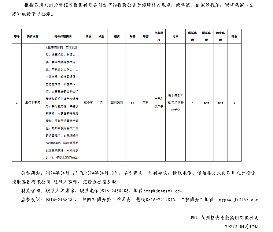 四川九洲投資控股集團有限公司關(guān)于招聘宣傳干事崗測試成績的公示
