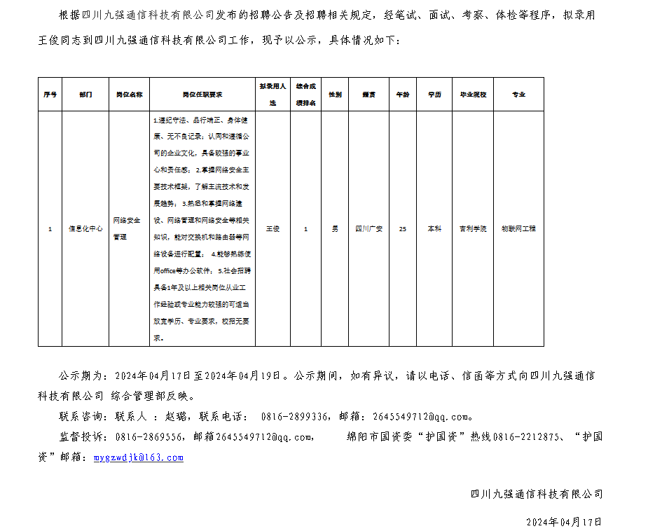 四川九強通信科技有限公司關(guān)于招聘網(wǎng)絡安全管理崗擬錄用人員的公示
