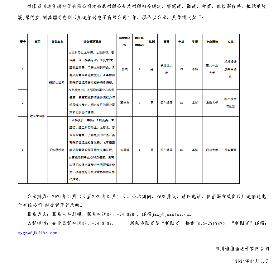 四川迪佳通電子有限公司關(guān)于招聘采購(gòu)認(rèn)證等崗位擬錄用人員的公示