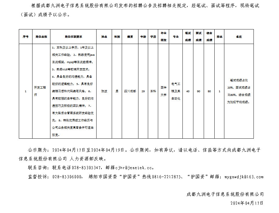 成都九洲電子信息系統(tǒng)股份有限公司關(guān)于招聘開發(fā)工程師測試成績的公示