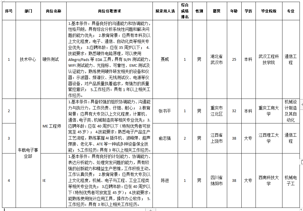 根據(jù)四川九州電子科技股份有限公司發(fā)布的招聘公告及招聘相關(guān)規(guī)定,經(jīng)筆試、面試、考察、體檢等程序,擬錄用聶威,陳進(jìn),張書平,俞志強(qiáng)同志到四川九州電子科技股份有限公司工作,現(xiàn)予以公示,具體情況如下: