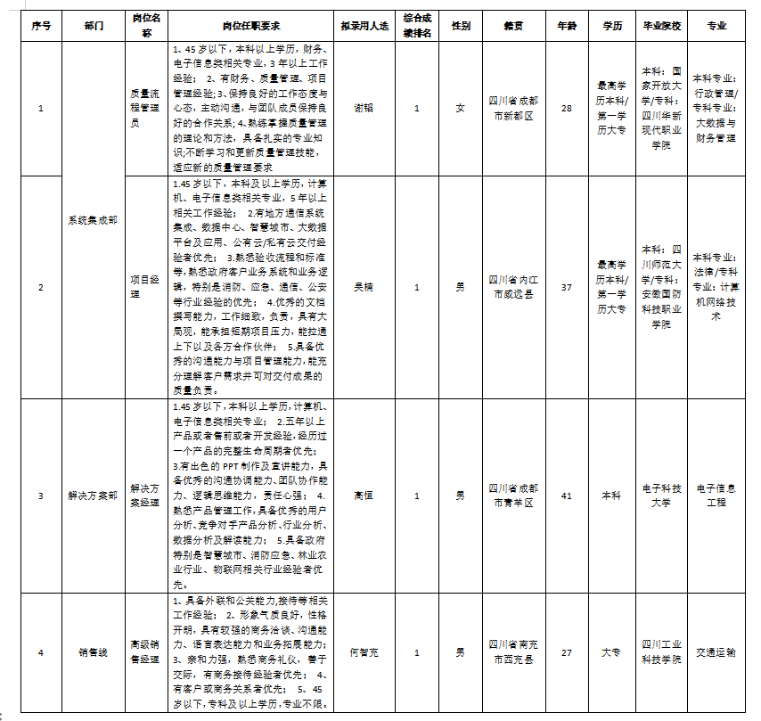 根據(jù)成都衛(wèi)通信息技術(shù)有限公司發(fā)布的招聘公告及招聘相關(guān)規(guī)定,經(jīng)筆試、面試、考察、體檢等程序,擬錄用高恒,吳楠,謝韜,何智充同志到成都衛(wèi)通信息技術(shù)有限公司工作,現(xiàn)予以公示,具體情況如下: