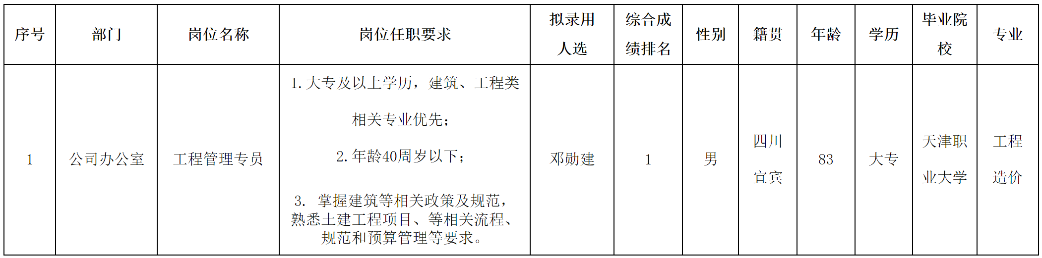 根據(jù)宜賓紅星電子有限公司發(fā)布的招聘公告及招聘相關(guān)規(guī)定,經(jīng)面試、考察等程序,擬錄用鄧勛建同志到公司辦公室工作,現(xiàn)予以公示,具體情況如下: