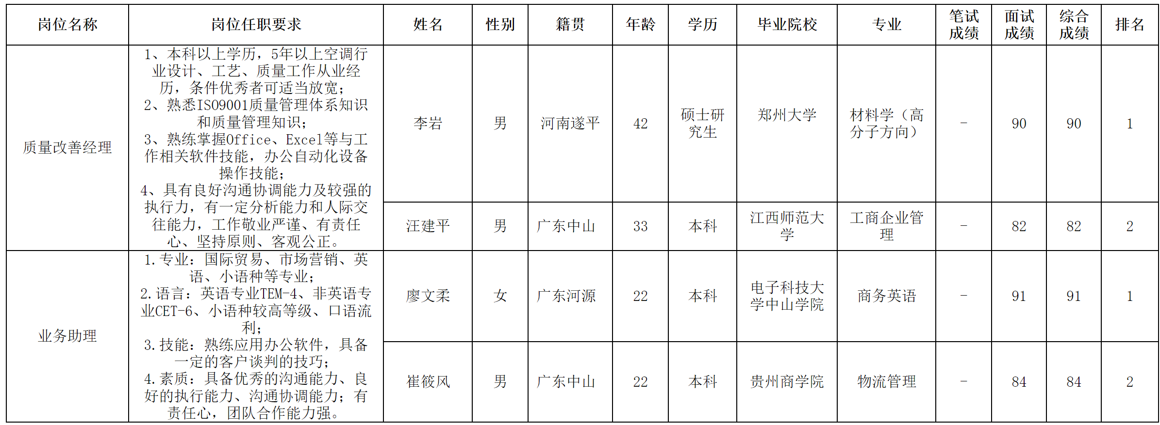 根據(jù)中山長(zhǎng)虹電器有限公司發(fā)布的招聘公告及招聘相關(guān)規(guī)定,經(jīng)面試程序,現(xiàn)將面試成績(jī)予以公示。