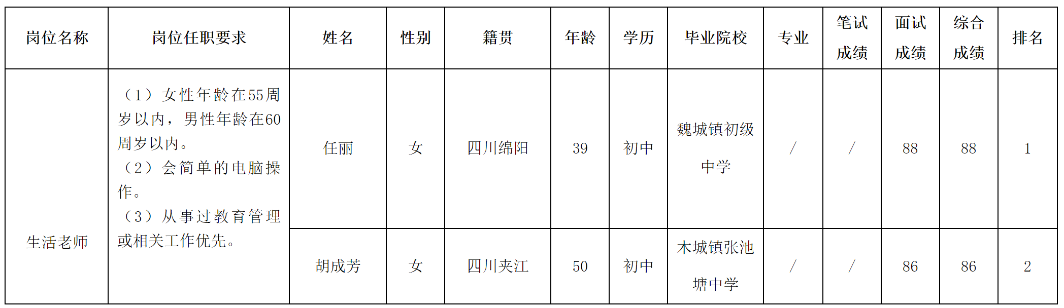 根據(jù)綿陽(yáng)中學(xué)實(shí)驗(yàn)學(xué)校發(fā)布的招聘公告及招聘相關(guān)規(guī)定,經(jīng)面試等程序,現(xiàn)將成績(jī)予以公示。