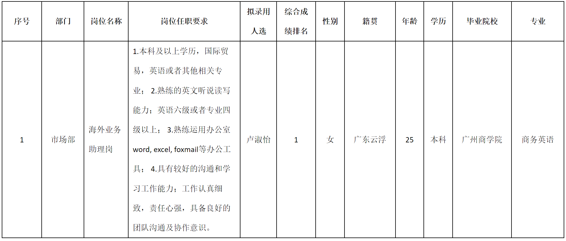根據深圳市九州智和科技有限公司發(fā)布的招聘公告及招聘相關規(guī)定,經筆試、面試、考察、體檢等程序,擬錄用盧淑怡同志到深圳市九州智和科技有限公司工作,現(xiàn)予以公示,具體情況如下: