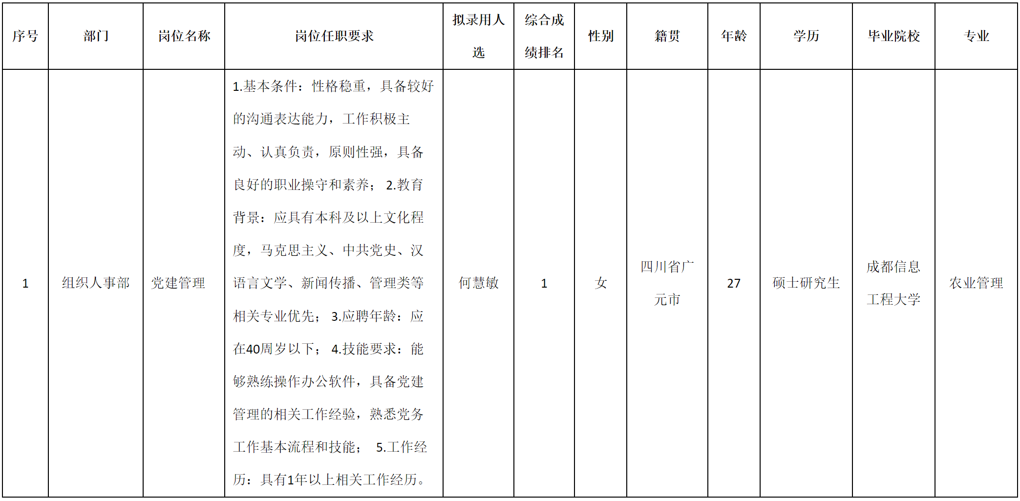 根據四川九州電子科技股份有限公司發(fā)布的招聘公告及招聘相關規(guī)定,經筆試、面試、考察、體檢等程序,擬錄用何慧敏同志到四川九州電子科技股份有限公司工作,現(xiàn)予以公示,具體情況如下: