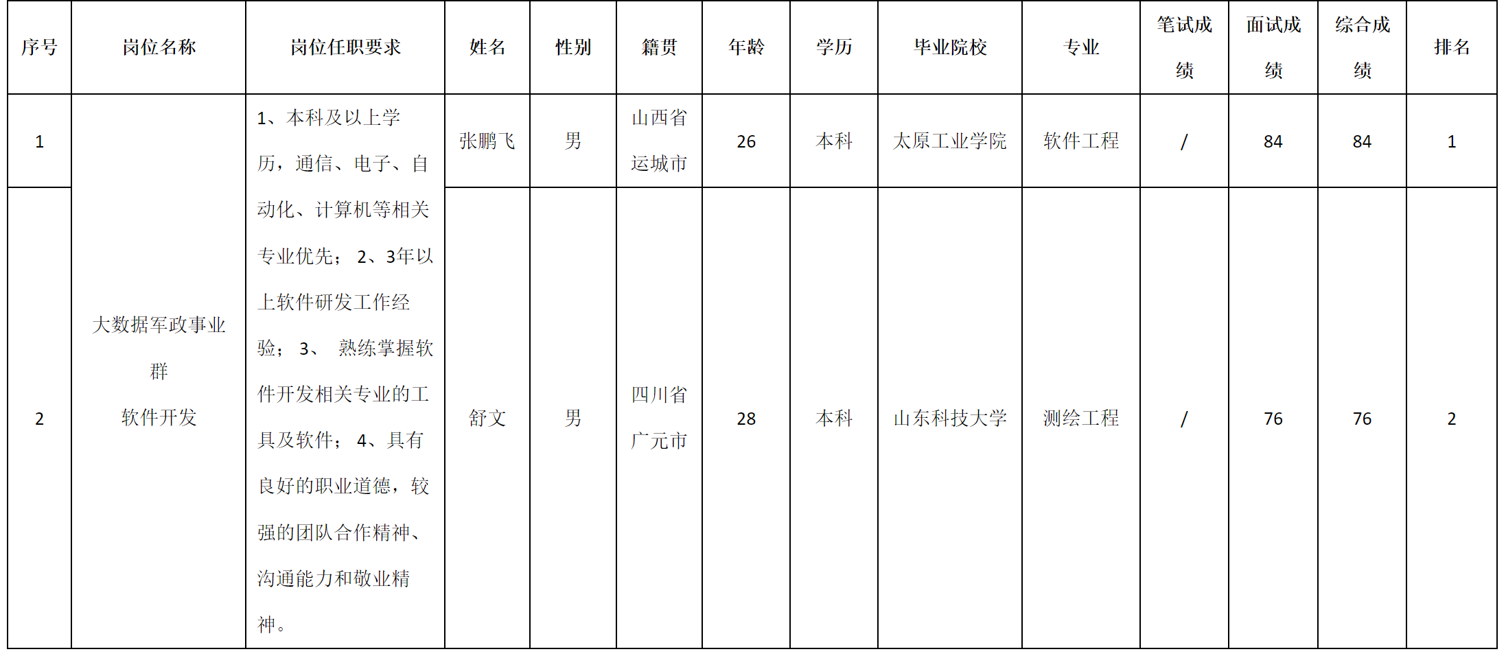 根據(jù)四川九州軟件有限公司發(fā)布的招聘公告及招聘相關(guān)規(guī)定,經(jīng)筆試、面試等程序,現(xiàn)將筆試(面試)成績(jī)予以公示。