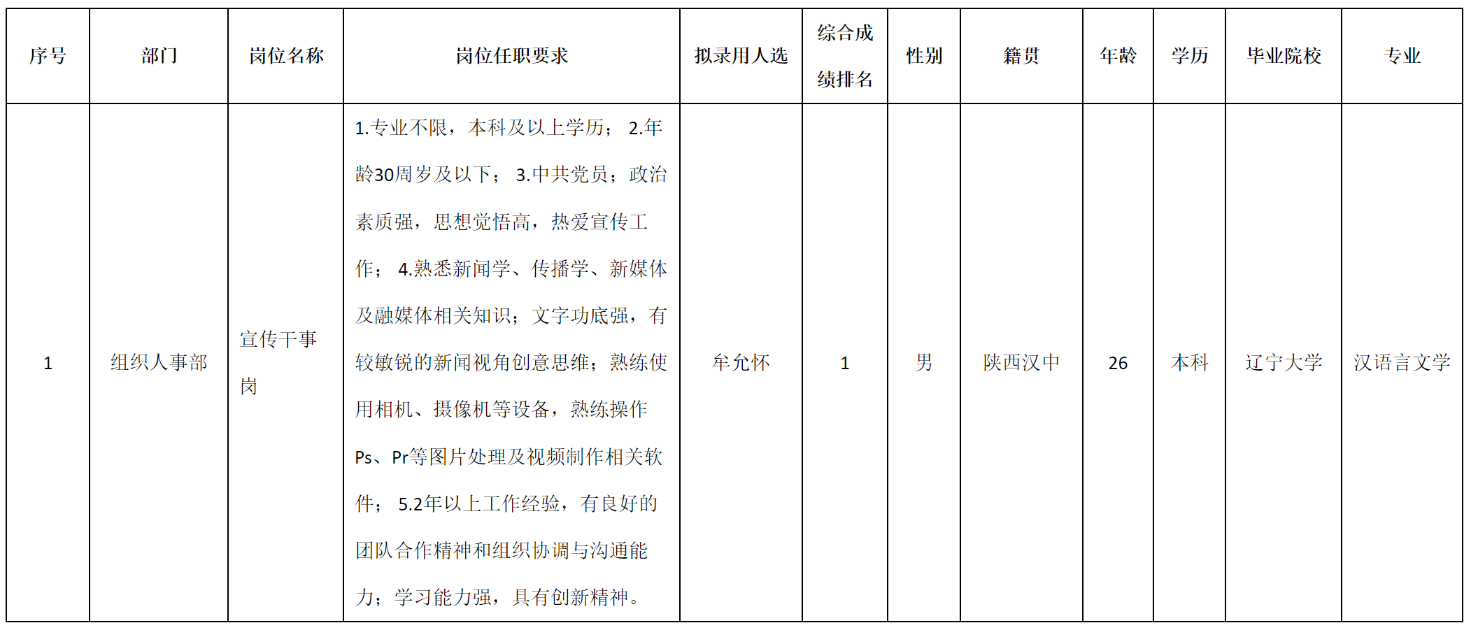 根據(jù)四川九州投資控股集團有限公司發(fā)布的招聘公告及招聘相關規(guī)定,經(jīng)筆試、面試、考察、體檢等程序,擬錄用牟允懷同志到四川九州投資控股集團有限公司工作,現(xiàn)予以公示,具體情況如下:
