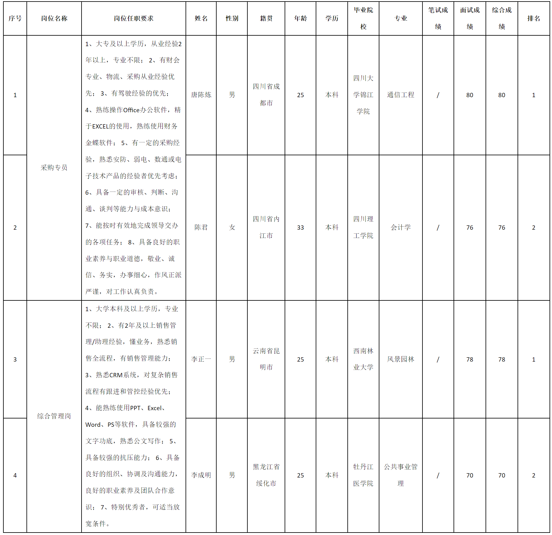 根據(jù)四川科瑞軟件有限責(zé)任公司發(fā)布的招聘公告及招聘相關(guān)規(guī)定,經(jīng)筆試、面試等程序,現(xiàn)將筆試(面試)成績(jī)予以公示。