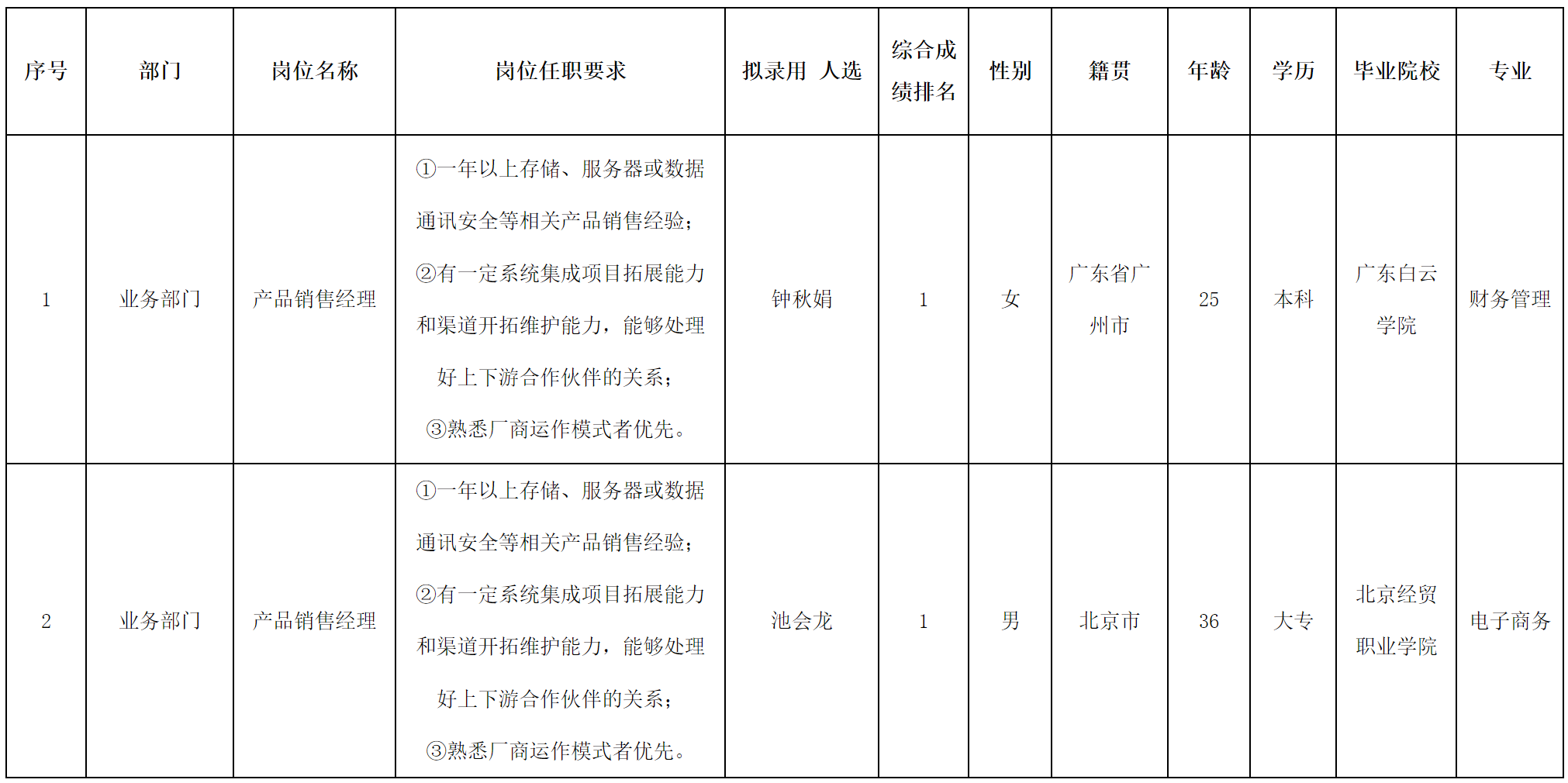 根據(jù)四川長虹佳華信息產(chǎn)品有限責(zé)任公司發(fā)布的招聘公告及招聘相關(guān)規(guī)定,經(jīng)面試、考察、體檢等程序,擬錄用鐘秋娟、池會龍同志到四川長虹佳華信息產(chǎn)品有限責(zé)任公司工作,現(xiàn)予以公示,具體情況如下